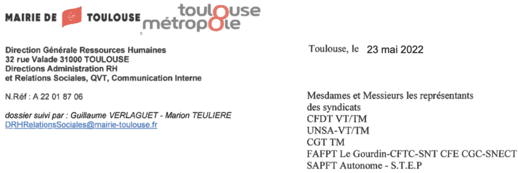 Par courrier commun du 28 avril dernier, vous avez saisi M. Jean Luc MOUDENC, Maire/Président de la Mairie de Toulouse Métropole sur vos préoccupations et demandes concernant le pouvoir d’achat des agents. Vous avez souhaité faire part de vos préoccupations concernant les difficultés liées au pouvoir d’achat. A ce titre, vous notez, et je vous en remercie, que nos collectivités ont bien pris la mesure des difficultés pouvant être rencontrées par les agents et leurs familles. En réponse, les éléments suivants vous sont apportés.