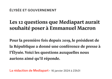 12 questions de Médiapart à Macron Tweeter Partager Partager 12 question de médiapart à Macron Imprimer cet article Télécharger cet article 26 janvier 2024
