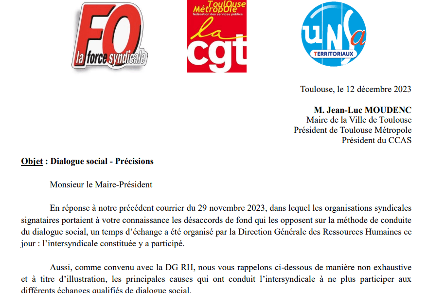 Objet : Dialogue social Précisions sur le dialogue social entre les syndicats et la collectivités Toulouse Métropole Monsieur le Maire-Président En réponse à notre précédent courrier du 29 novembre 2023, dans lequel les organisations syndicales signataires portaient à votre […]